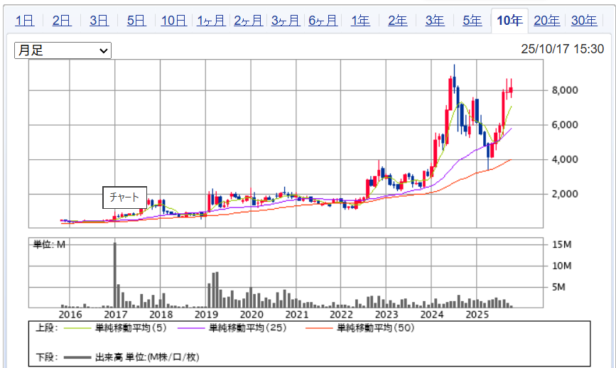現在のチャートは日足、週足、月足とも移動平均線が右肩上がりになっていて、株価も移動平均線の上側にありさらなる上昇が期待できそう。中長期投資では月足を中心に見ることが多いです。2024年に急上昇してその後調整が入り下がりましたが現在再び上昇に転じ最高値更新を狙っているように感じます。