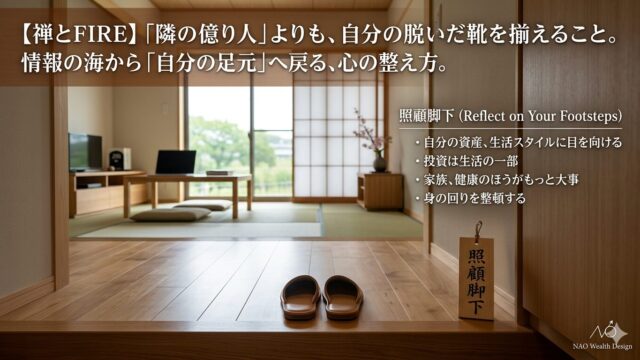 FIRE【禅とFIRE】「隣の億り人」よりも、自分の脱いだ靴を揃えること。 2026年4月21日 NAO 「他人の靴」ばかり見ていないか FIRE生活に入り、時間が自由に使えるようになると、ふと手持ち無沙汰な瞬間にスマホを開いてしまいます …