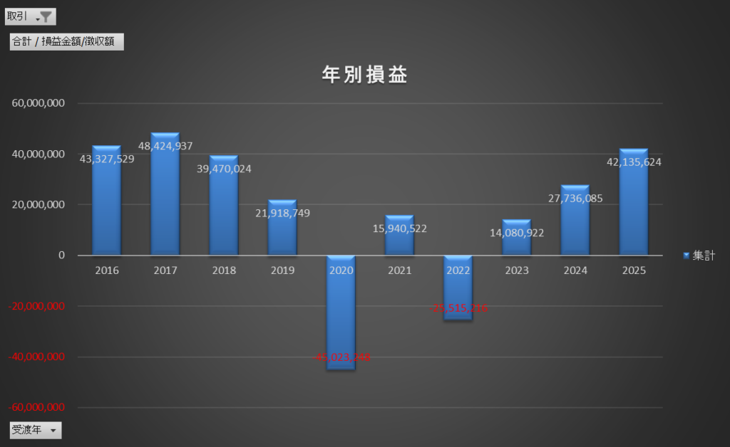 以下は特に成果が出るようになってからの年ごとの損益のグラフです。