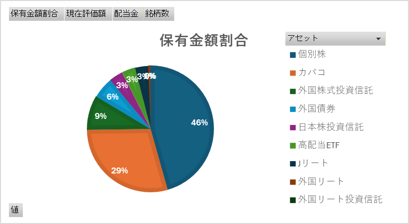 それではまずはポートフォリオをアセット別に分類したものから公開します。