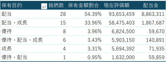 次に保有している銘柄をどういう目的で保有しているかに分類してみました。