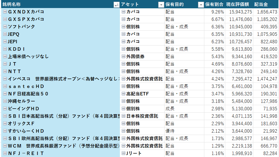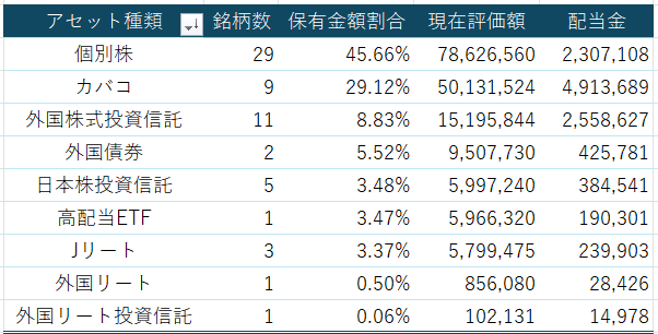 さて、それでは本題に入っていきますが、今回はポートフォリオを「アセット別」「保有目的別」「主要銘柄別」に分けて色んな角度から分類分けし、さらにそれらからどれぐらいの配当金が得られているかも公開します。