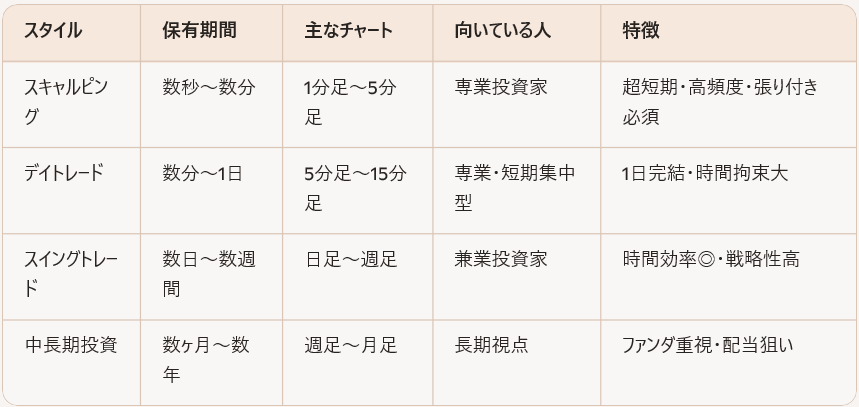 📊 投資スタイルの比較|スキャル・デイトレ・スイング・中長期